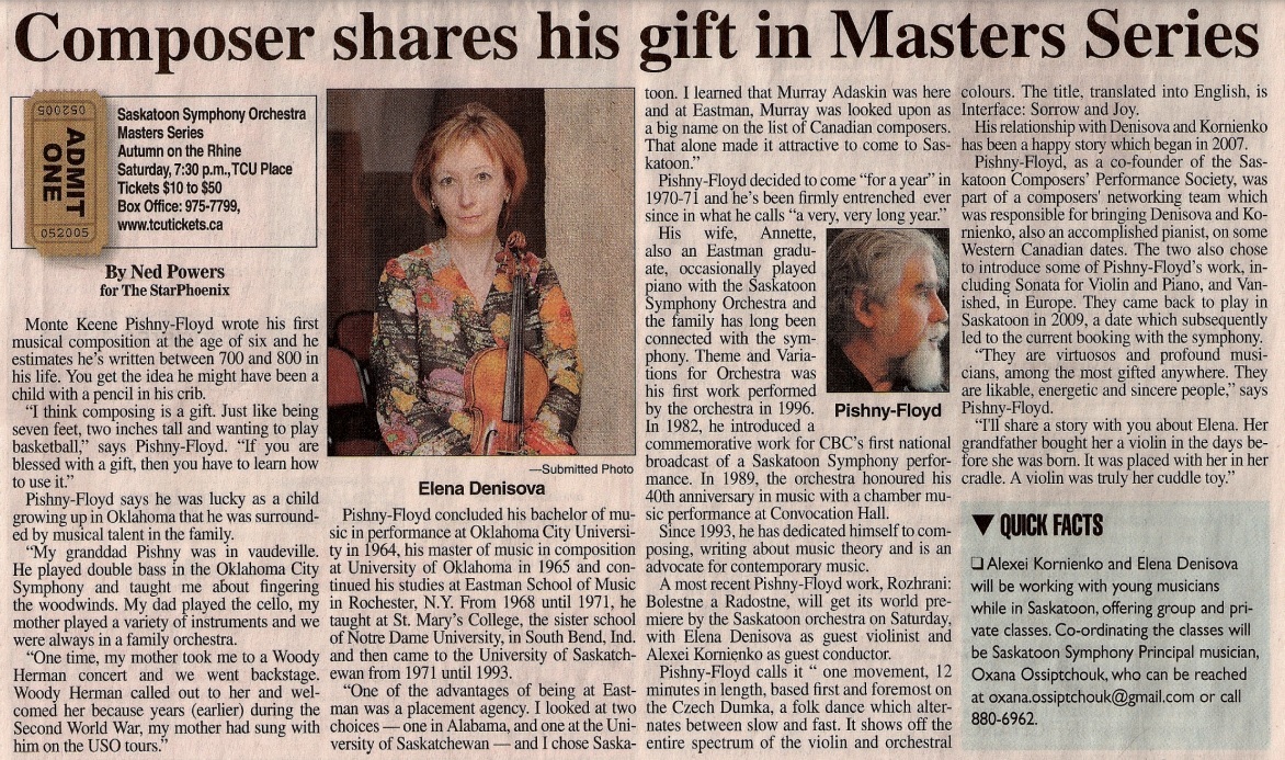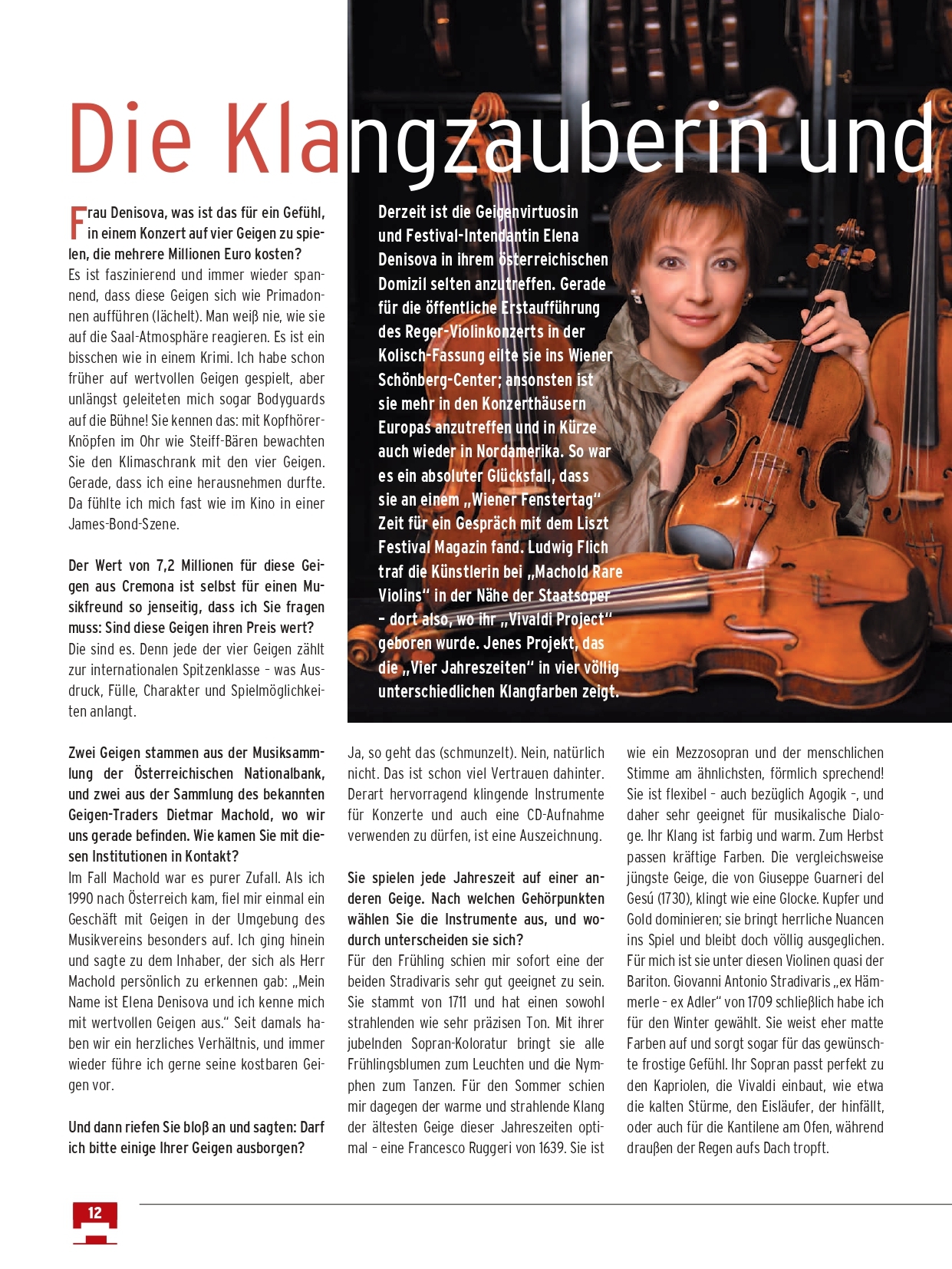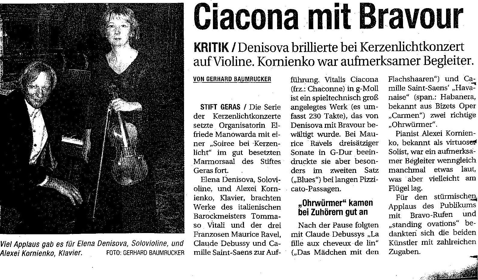 ... "Elena Denisova, der dieses Konzert gewidmet und wohl auf den Leib geschrieben ist, spielte absolut brillant und glänzte sowohl mit sinnlicher Tongebung als auch mit virtousen Zaubereien auf der Geige."